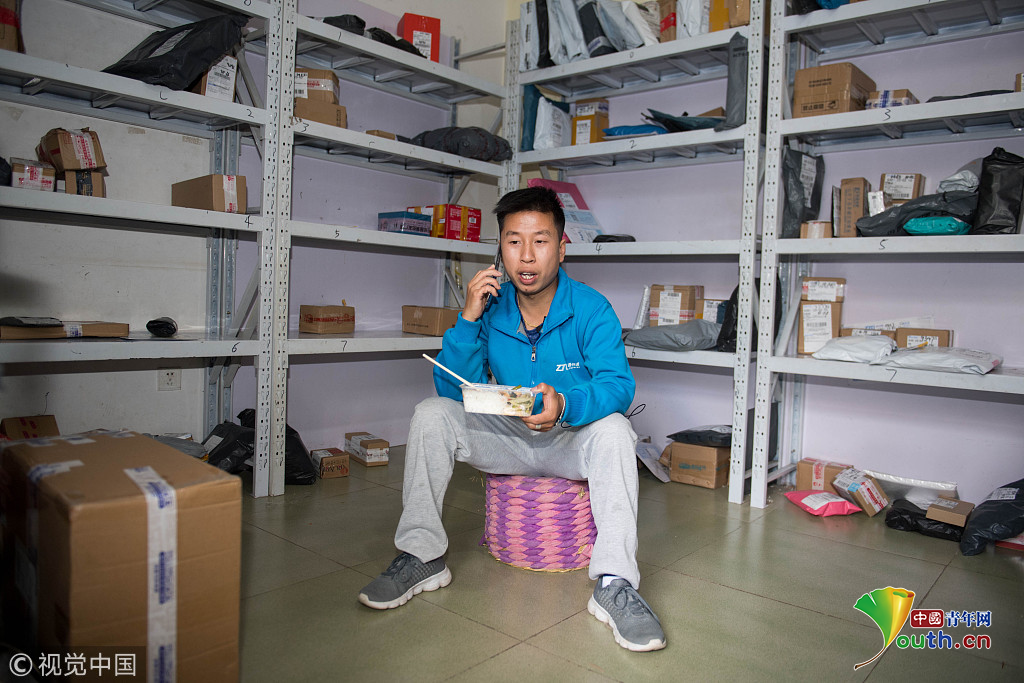 2018年10月16日,云南省昆明市,攝影師實(shí)拍90后快遞員熊忠桃的一天工作。作為一名快遞員,他25歲就買了房,9月份收入3萬多。圖片作者:銳圖