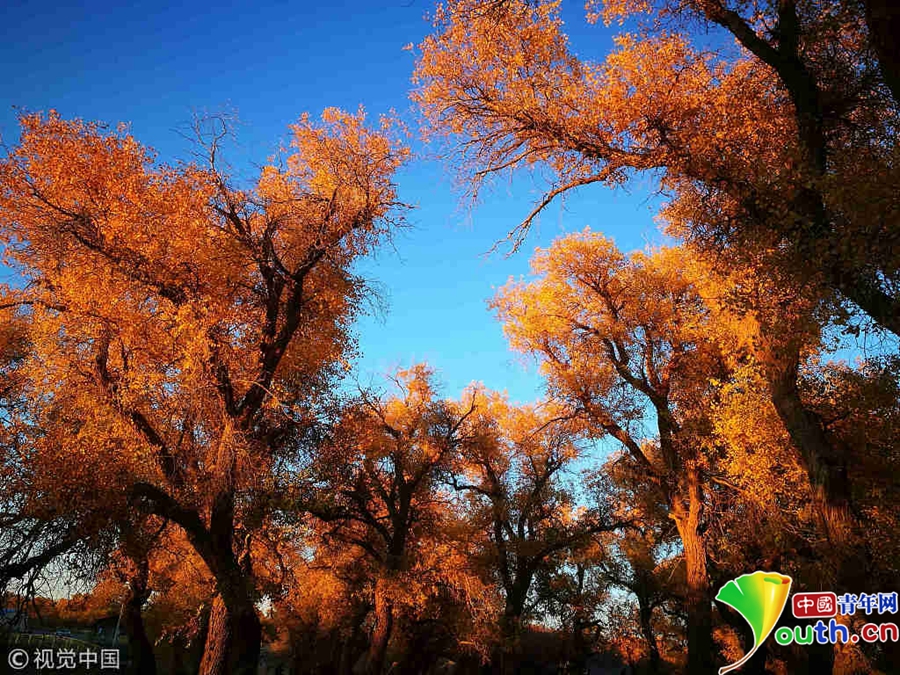 大片的胡楊樹葉由綠變黃,一眼望去,陽光下金色的樹葉襯著湛藍的天空于風(fēng)中婆娑起舞。