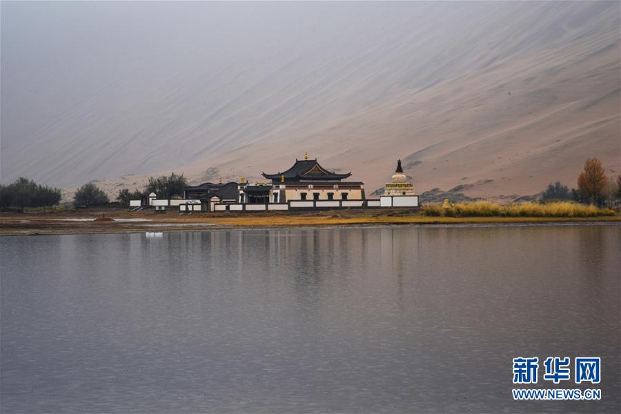 巴丹吉林廟位于名為“廟海子”的湖泊旁(10月19日攝)。 巴丹吉林沙漠位于內(nèi)蒙古西部阿拉善盟,是中國第三大沙漠,沙丘起伏的曲線陡變成高聳的沙山,碧藍(lán)的湖泊散落在沙海間。 新華社記者 李仁虎 攝