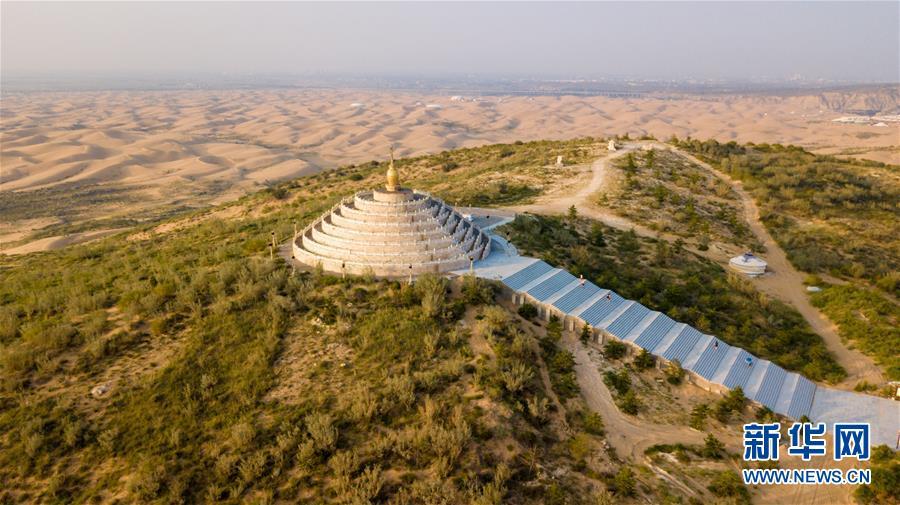 庫布其沙漠中銀肯塔拉敖包周邊種植的防風固沙林(7月31日無人機拍攝)。 新華社記者彭源攝