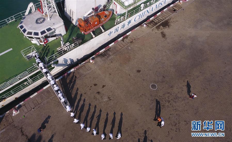 11月3日,海事執(zhí)法人員登上“海巡21”輪(無人機(jī)拍攝)。 當(dāng)日,隨著“海巡21”輪緩緩駛離??诤J卤O(jiān)管基地碼頭,由瓊桂粵海事部門共同開展的瓊州海峽、北部灣及環(huán)海南島水域跨轄區(qū)聯(lián)合巡航執(zhí)法活動揭開序幕。 新華社記者楊冠宇攝