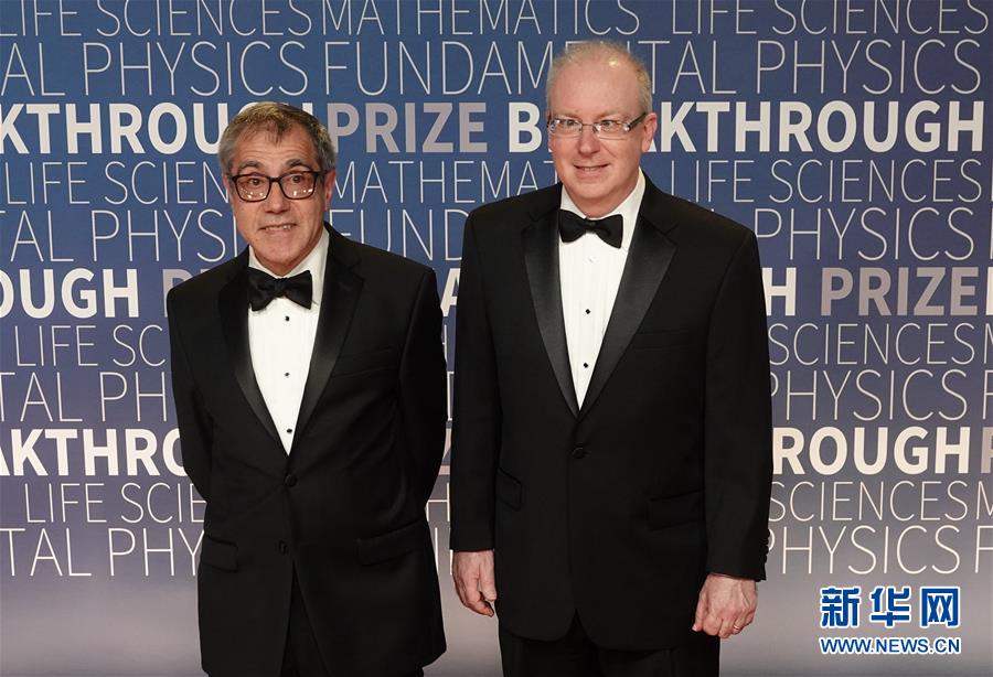 11月4日,在美國舊金山灣區(qū),獲得“基礎(chǔ)物理學(xué)突破獎”的查爾斯·凱恩(右)和尤金·梅林出席紅毯儀式。 新華社記者吳曉凌攝