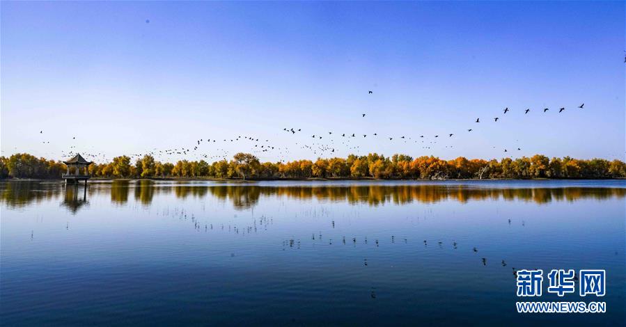 在位于新疆巴音郭楞蒙古自治州輪臺(tái)縣的一處胡楊林里,一群鳥從水面上飛過(10月25日攝)。 新華社記者 趙戈 攝