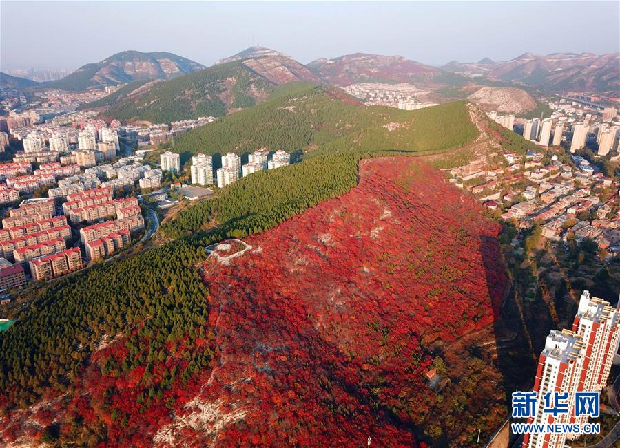深秋時(shí)節(jié),山東濟(jì)南楔子山山脊兩邊種植的植被形成“一山雙色”景觀,令人稱奇。