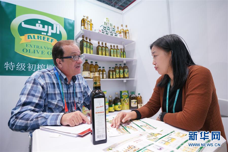 11月6日,敘利亞橄欖油經(jīng)銷(xiāo)商胡薩姆(左)介紹橄欖油產(chǎn)品。 新華社記者 孟鼎博 攝
