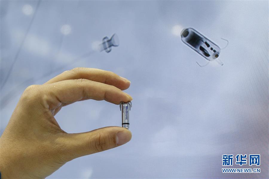 11月6日,美國(guó)美敦力公司工作人員展示全球最小的心臟起搏器。它也是全球首款無(wú)導(dǎo)線心臟起搏器,體積僅有膠囊大小,重量?jī)H2克。 新華社記者 張玉薇 攝