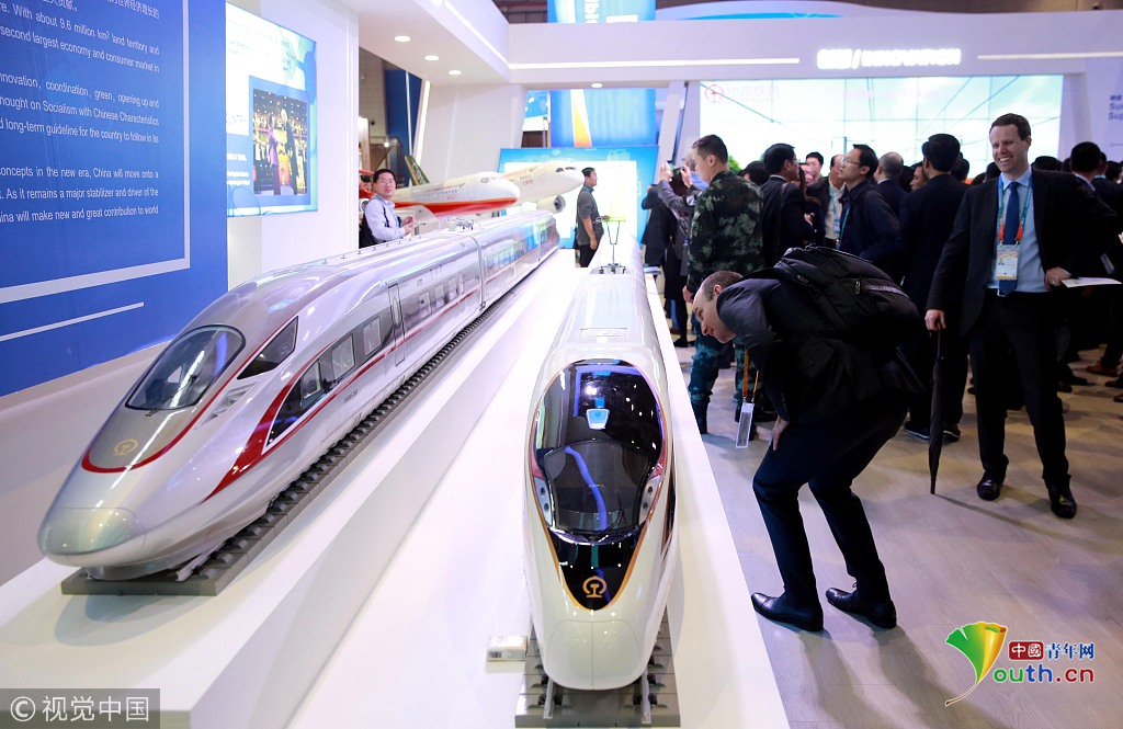 2018年11月6日,上海,首屆中國國際進(jìn)口博覽會(huì)國家展上,共有82個(gè)國家、3個(gè)國際組織設(shè)立了71個(gè)展臺(tái)。中國館展示的復(fù)興號(hào)。視覺中國