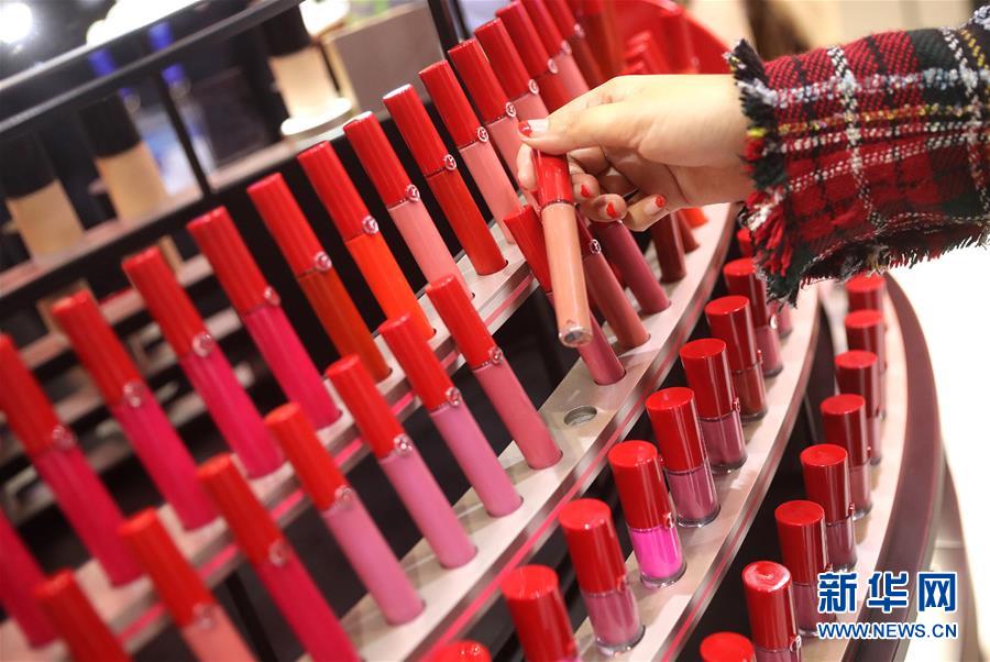 11月6日,參觀者在歐萊雅集團展臺試用化妝品。 新華社記者 陳飛 攝