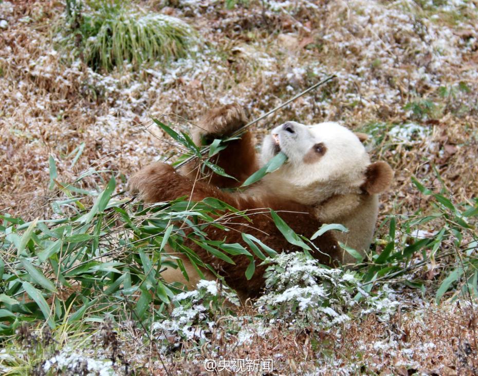 秦嶺大熊貓野化培訓(xùn)佛坪基地,7歲的棕色大熊貓七仔是目前全世界唯一能看到的棕色大熊貓活體。今年是它在基地過的第二個冬天,每逢下雪,七仔就興奮地滿園子跑,變身“雪花熊”。央視記者李志 王志杰 圖片來源:央視新聞官方微博