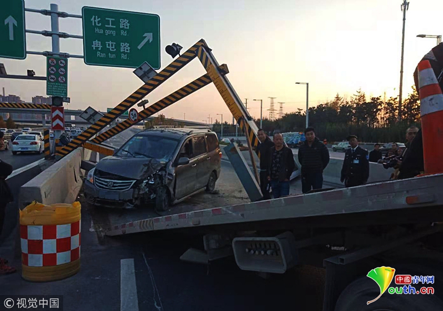 2018年11月19日下午,鄭州市西三環(huán)化工路立交橋,沿西三環(huán)由北向南方向上橋口處,一輛商務(wù)面包車失控撞塌了3米限高架,橋上交通瞬間中斷。 圖片來源:視覺中國