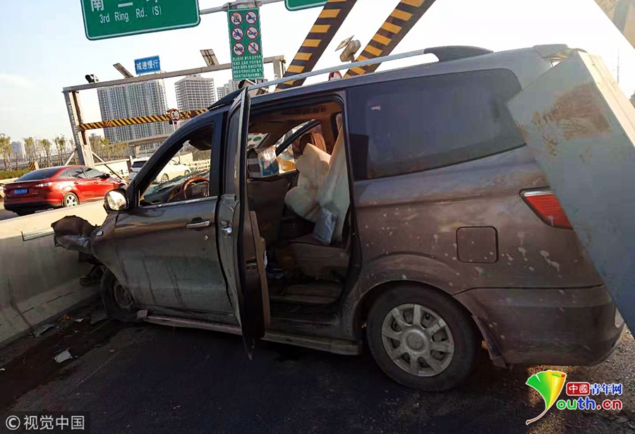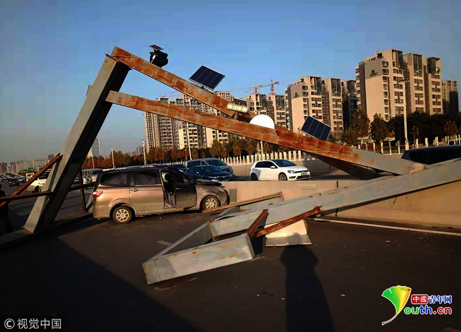 2018年11月19日下午,鄭州市西三環(huán)化工路立交橋,沿西三環(huán)由北向南方向上橋口處,一輛商務(wù)面包車失控撞塌了3米限高架,橋上交通瞬間中斷。 圖片來源:視覺中國