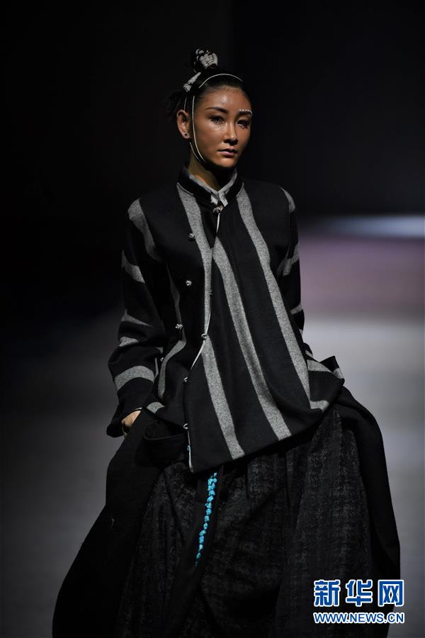 模特在AJ-NAMO藏裝秀上展示藏族設(shè)計師阿佳娜姆設(shè)計的時裝(11月18日攝)。 新華社記者 普布扎西攝