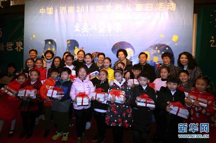 11月20日,在濟南舉行的世界兒童日主題活動上,孩子們拿著獲贈的經典書籍合影留念。 新華社發(fā)(李俊卓攝)