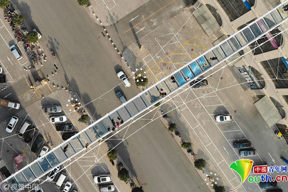 2018年11月28日,石家莊市區(qū)內(nèi)的一座玻璃吊橋在網(wǎng)絡(luò)上走紅,游客們置身于透明的玻璃吊橋上,望著地面川流不息的車輛,伴隨玻璃破裂的特效聲,不禁膽戰(zhàn)心驚。這座玻璃吊橋位于石家莊南二環(huán)附近,橋體橫跨塔通大街,長(zhǎng)100米,高30米,。橋面由52塊特質(zhì)玻璃構(gòu)成,其中4塊為特效玻璃,游客腳踩上去就會(huì)發(fā)出玻璃破裂的聲音。