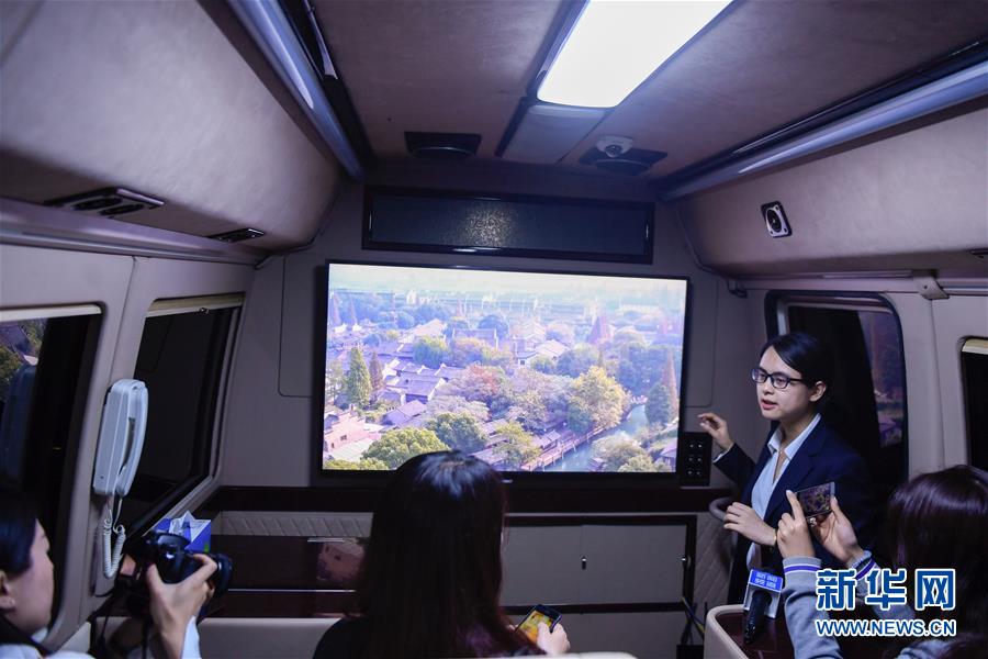 在浙江移動烏鎮(zhèn)分水墩營業(yè)廳外,工作人員在一輛體驗巴士內介紹通過5G移動傳輸技術實現(xiàn)的8K高清的視頻畫面實時展示(10月30日攝)。 新華社記者黃宗治攝