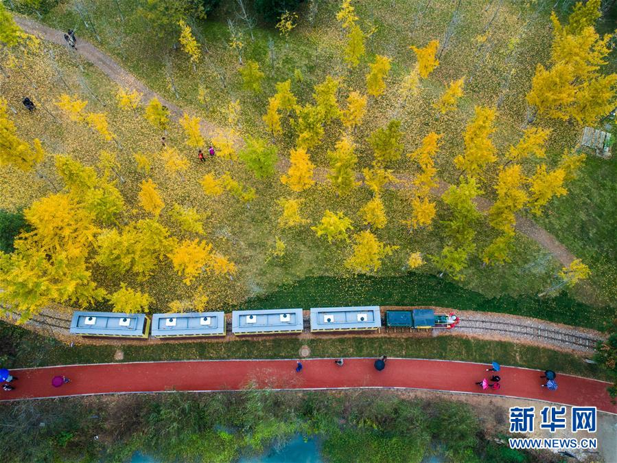 一列觀光小火車帶著游客穿行在銀杏林里(11月16日無人機拍攝)。近日,在浙江省長興縣小浦鎮(zhèn),“十里銀杏長廊”和近千畝花海經(jīng)過近一年的升級改造后,以嶄新的面貌與游客見面?;ê?、觀光小火車、古村民宿、銀杏長廊等旅游項目全面提升了小浦鎮(zhèn)鄉(xiāng)村旅游的品質。新華社記者 徐昱 攝