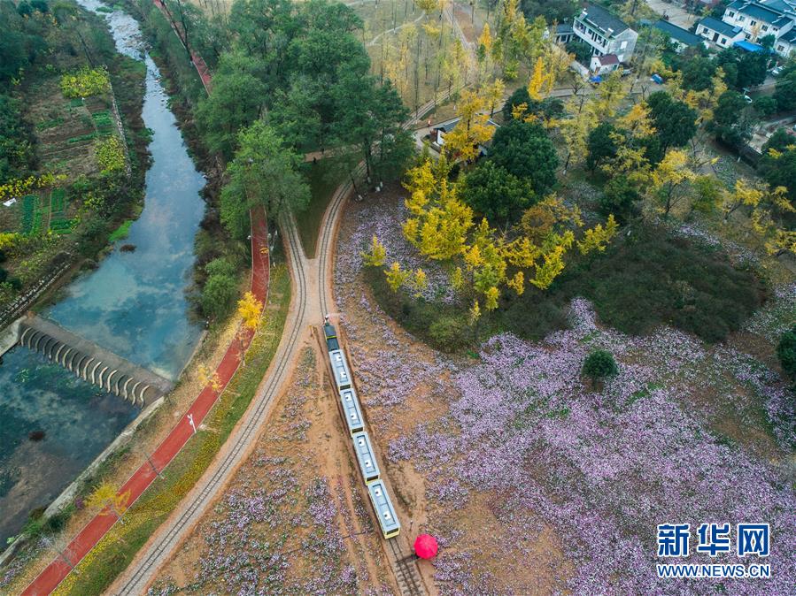 一列觀光小火車帶著游客穿行在銀杏林和花海之間(11月16日無人機拍攝)。近日,在浙江省長興縣小浦鎮(zhèn),“十里銀杏長廊”和近千畝花海經(jīng)過近一年的升級改造后,以嶄新的面貌與游客見面?;ê?、觀光小火車、古村民宿、銀杏長廊等旅游項目全面提升了小浦鎮(zhèn)鄉(xiāng)村旅游的品質。新華社記者 徐昱 攝