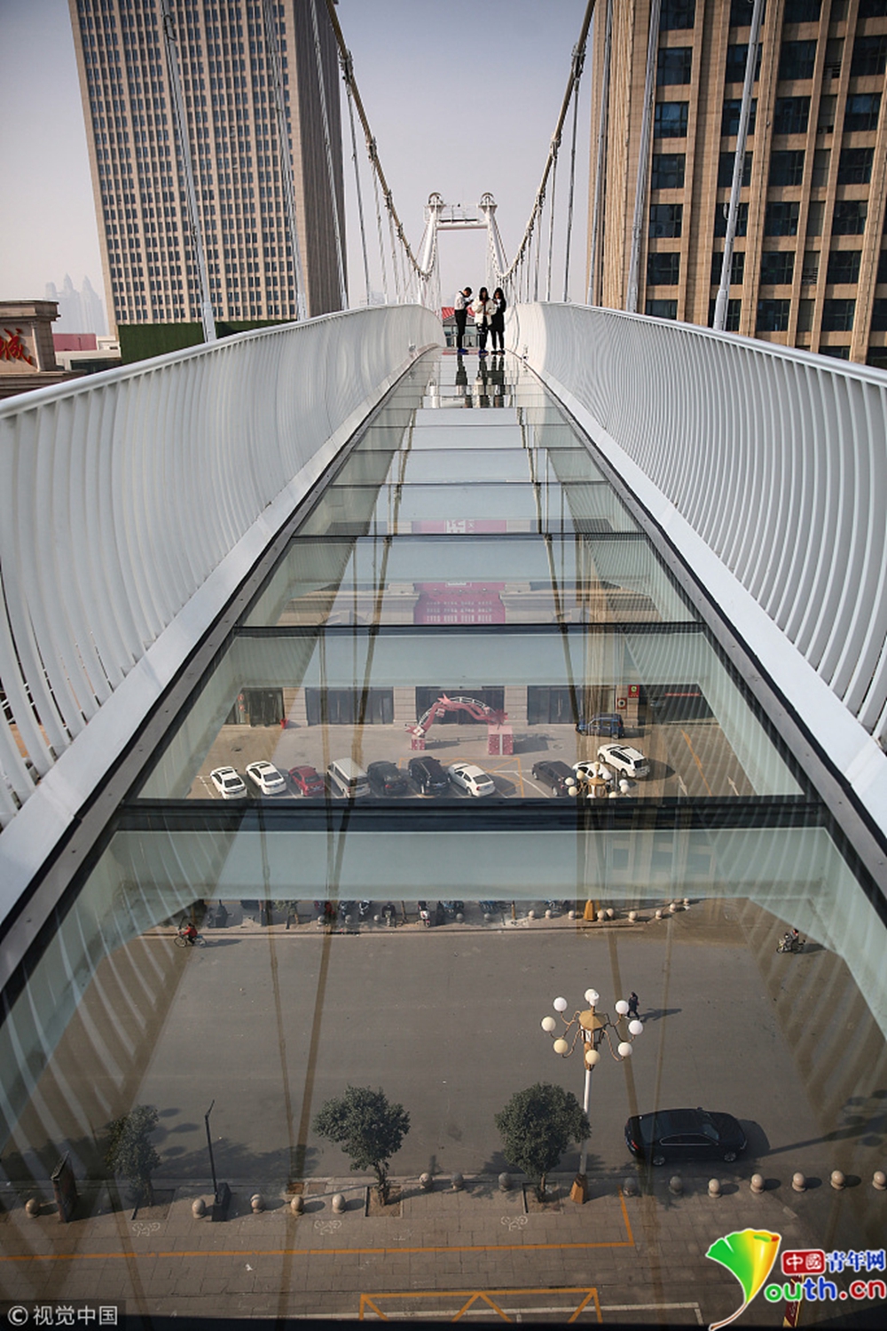 2018年11月28日,石家莊市區(qū)內(nèi)的一座玻璃吊橋在網(wǎng)絡(luò)上走紅,游客們置身于透明的玻璃吊橋上,望著地面川流不息的車輛,伴隨玻璃破裂的特效聲,不禁膽戰(zhàn)心驚。這座玻璃吊橋位于石家莊南二環(huán)附近,橋體橫跨塔通大街,長(zhǎng)100米,高30米,。橋面由52塊特質(zhì)玻璃構(gòu)成,其中4塊為特效玻璃,游客腳踩上去就會(huì)發(fā)出玻璃破裂的聲音。