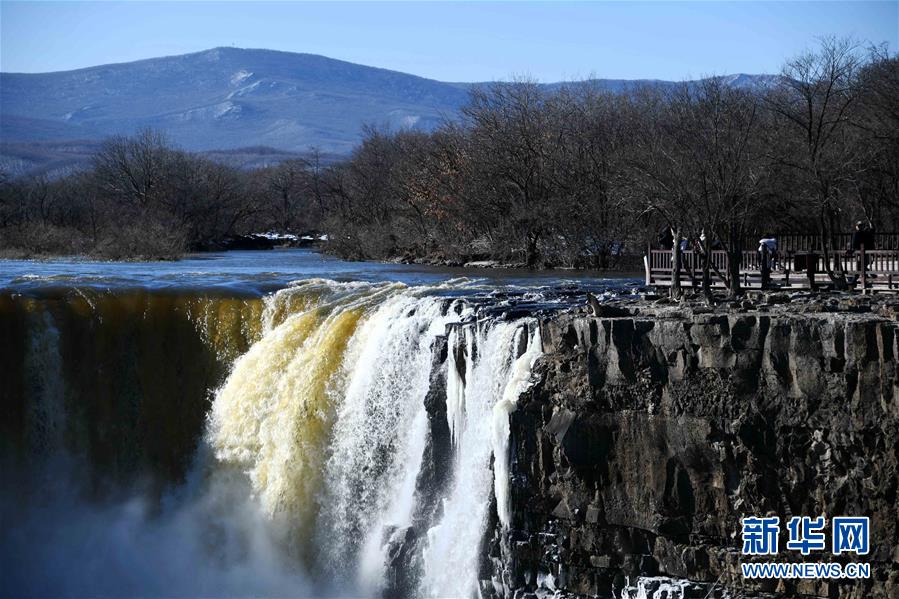 12月5日,游客在觀賞吊水樓瀑布。 受上游來水量大和近期氣溫偏高等因素影響,位于黑龍江東南部的火山堰塞湖——鏡泊湖的吊水樓瀑布水量充沛,展現(xiàn)出飛流直下、水霧升騰的冬季奇觀,引來許多游人觀賞。 新華社記者王建威攝
