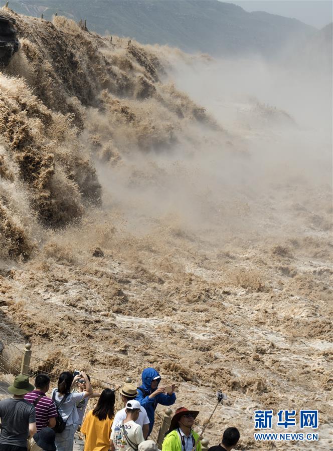 7月19日,游客在陜西境內(nèi)的壺口瀑布群前留影。 近日,隨著黃河上游降雨增多,黃河干流進入主汛期,位于晉陜大峽谷的壺口再現(xiàn)壯美瀑布群。 新華社記者 陶明 攝