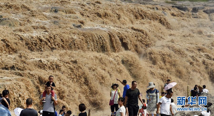 7月19日,游客在陜西境內(nèi)的壺口瀑布群前留影。 新華社記者陶明 攝