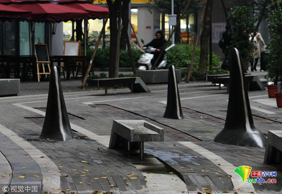 2018年11月20日,重慶一園區(qū)內馬路中間突出一排“鯊魚鰭”,司機路人都被“嚇懵”了。突出的鯊魚鰭將兩側的車行道分開,原來,這是為了進一步保證車流的有序進出和行人過街安全,同時也為了防止亂停車占用人行道,設置了這種異形“隔離樁”。圖片來源:視覺中國