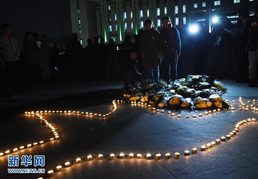 12月12日,學(xué)生將組成紀(jì)念圖案的白燭擺放整齊。 當(dāng)晚,南京東南大學(xué)學(xué)生在校園舉行“燭光祭”活動,悼念南京大屠殺遇難同胞。學(xué)生們點(diǎn)燃白燭,獻(xiàn)花默哀,表達(dá)哀思。 新華社記者 孫參 攝