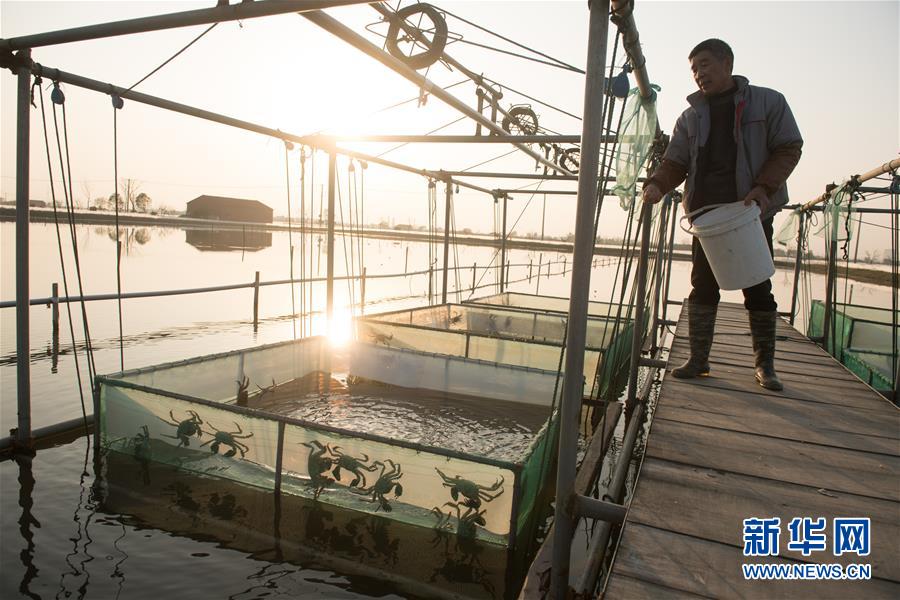 12月17日,在湖州市吳興區(qū)高新區(qū)廟港人千畝水產(chǎn)園,蟹農(nóng)給大閘蟹投喂玉米。 新華社記者翁忻旸攝