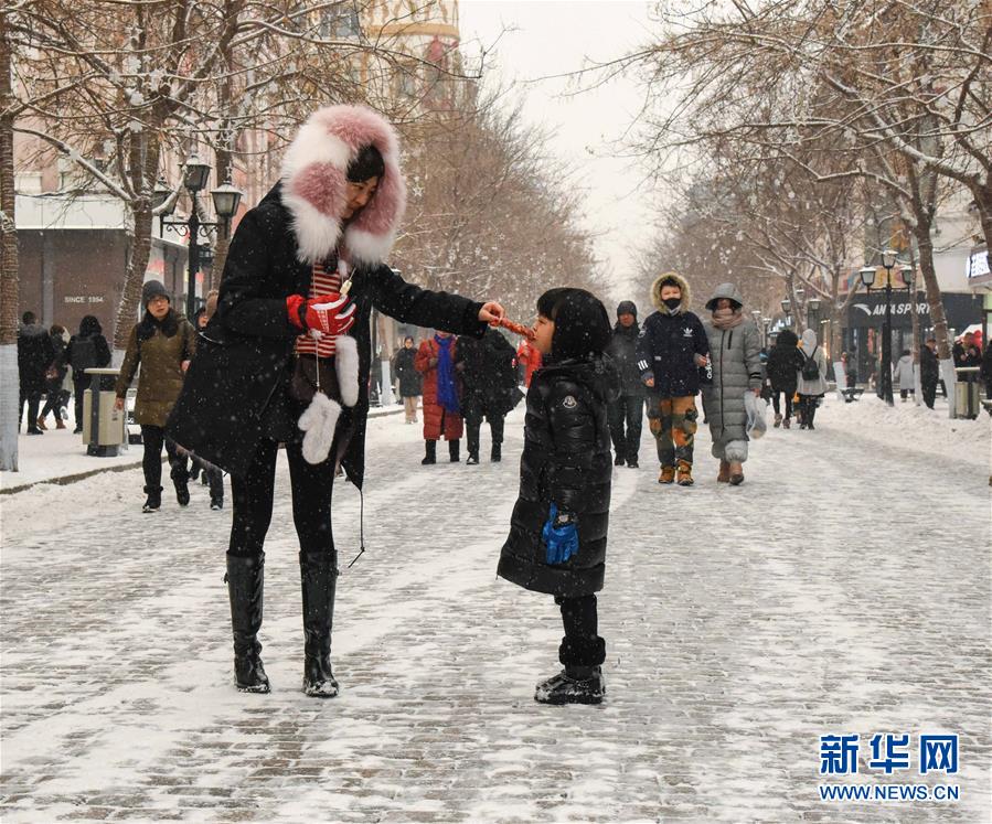 12月21日,游客在哈爾濱中央大街游覽。當(dāng)日,“冰城”哈爾濱迎來降雪天氣,整個城市變得銀裝素裹。新華社記者韓宇攝