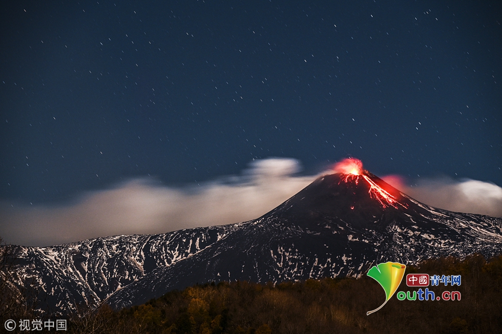 意大利埃特納火山噴發(fā) 大量巖漿照亮火山口