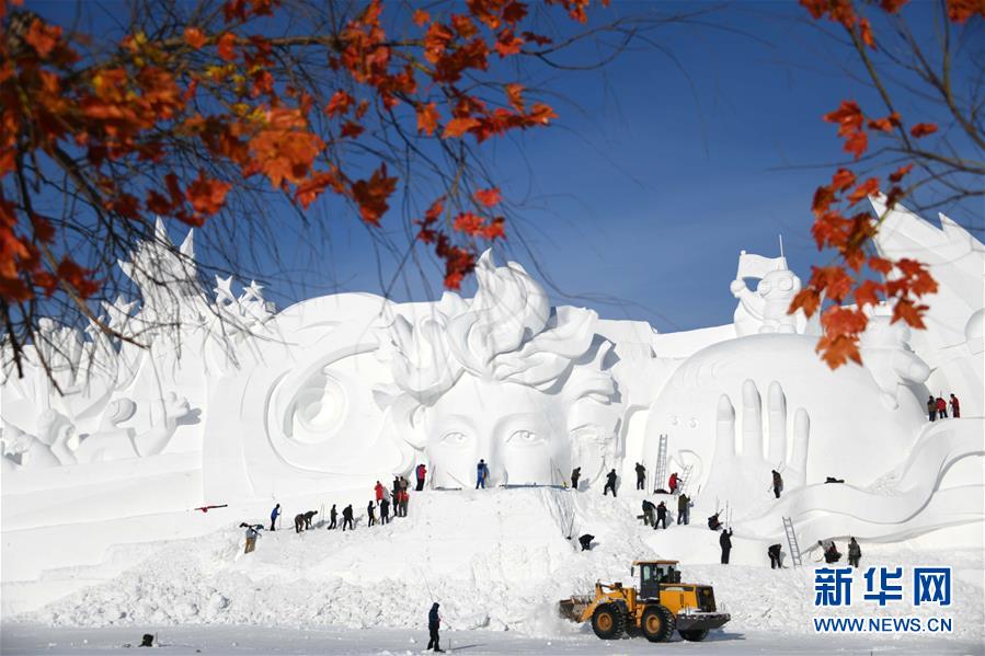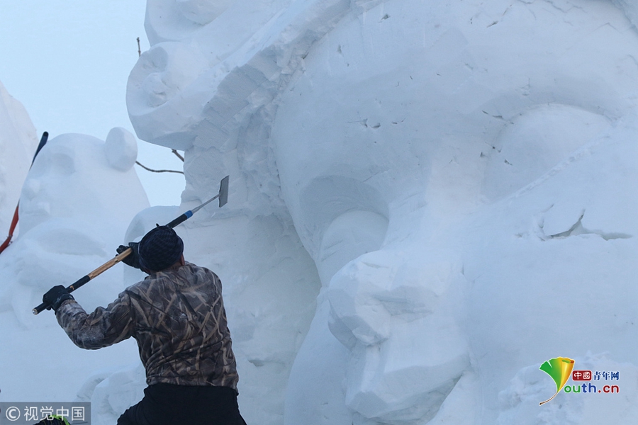 2018年12月13日,黑龍江省哈爾濱市,國內最大的雪雕盛會太陽島雪博會正在緊鑼密鼓建設中,部分雪雕雛形已現(xiàn),雪雕師正在精雕細刻打磨中。