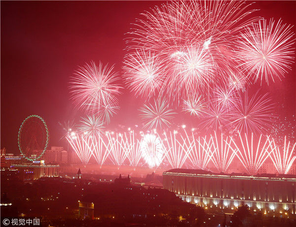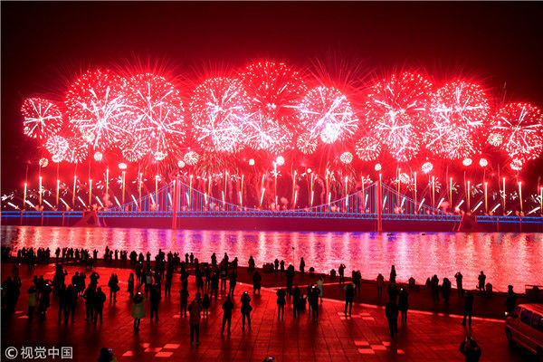 2017年12月31日,黑龍江黑河。近萬(wàn)民黑河市民和數(shù)十名俄羅斯游客,身穿“中國(guó)紅”在中央街跳起熱舞迎接新年。