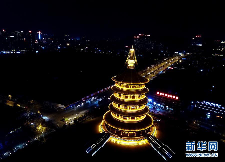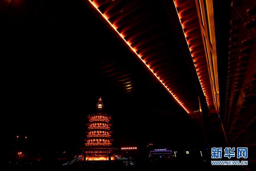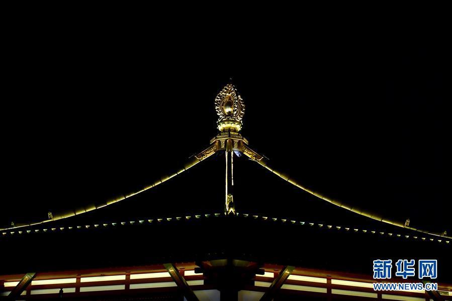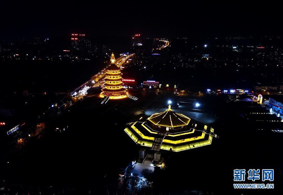 在古都河南洛陽的夜色中,隋唐洛陽城國家遺址公園內(nèi)的明堂和天堂兩棟古建筑格外閃耀。 新華社記者馮大鵬 攝