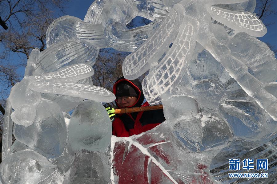 12月27日,選手們?cè)诒荣愔型晟票褡髌贰?當(dāng)日,第十六屆黑龍江省大學(xué)生冰雕藝術(shù)設(shè)計(jì)創(chuàng)作大賽在哈爾濱兆麟公園落下帷幕,全省高校共有99支隊(duì)伍參賽。 新華社記者曹霽陽攝
