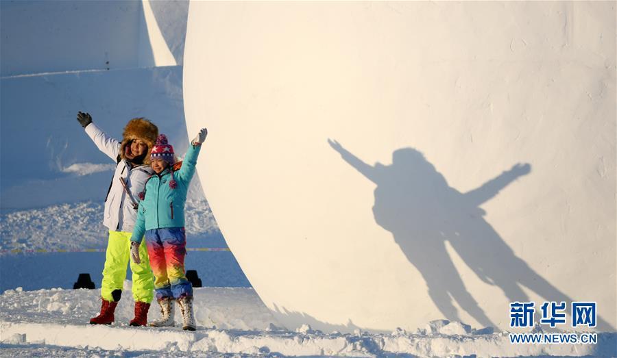 12月29日,在太陽島雪博會園區(qū),游客在雪雕作品前留影。 當日,第31屆哈爾濱太陽島國際雪雕藝術博覽會正式開園。本屆太陽島雪博會以“歡樂雪博會·夢幻雪域游”為主題,占地90萬平方米,分為五大景區(qū)。 新華社記者 王建威 攝