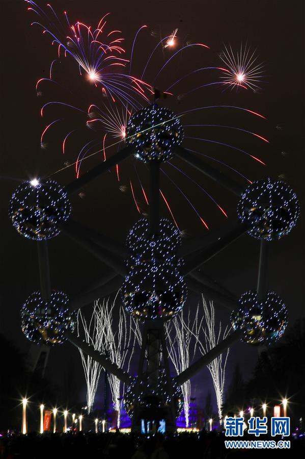 1月1日,比利時首都布魯塞爾的地標性建筑——原子球塔附近煙花綻放。 新華社記者鄭煥松攝