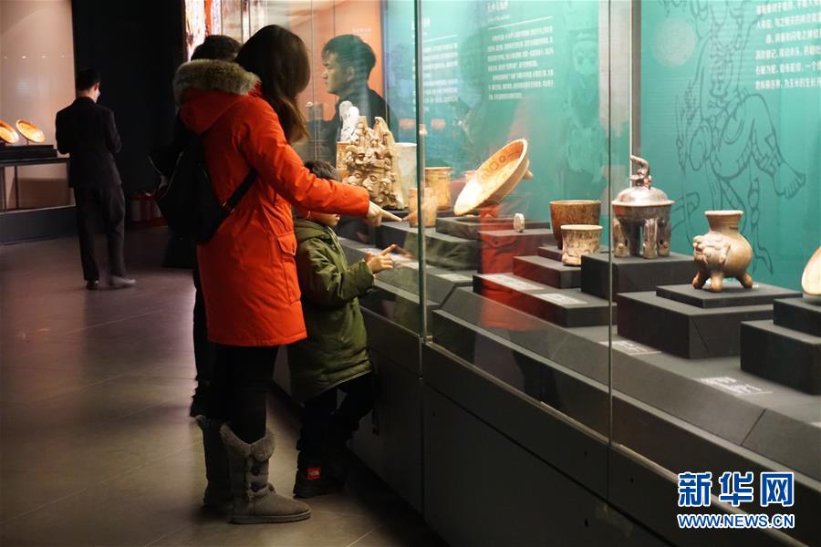 1月1日,觀眾在金沙遺址博物館里參觀跨文明特展展品。  新華社記者康錦謙攝