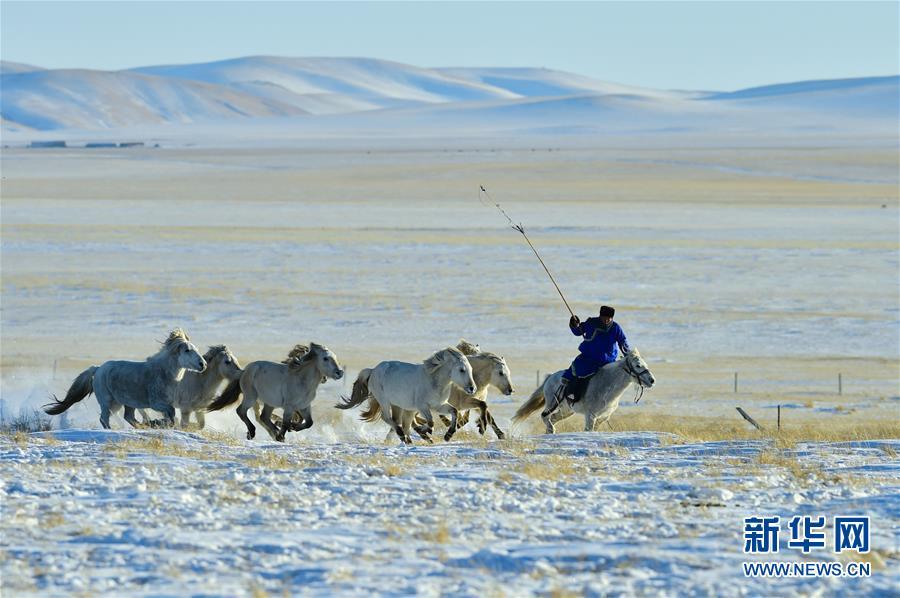 1月8日,牧民進(jìn)行套馬表演。 時(shí)下正值草原冬季旅游旺季,內(nèi)蒙古自治區(qū)西烏珠穆沁旗的牧民們?cè)谘┰弦徽股硎郑瑸橛慰驼宫F(xiàn)獨(dú)特的民族風(fēng)情。 新華社記者 鄒予 攝