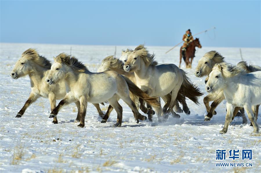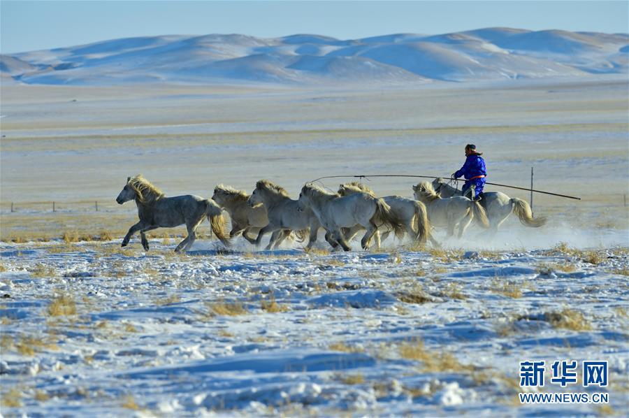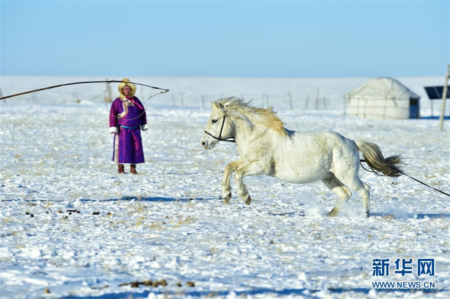 1月8日,牧民在馴服一匹烈馬。 時下正值草原冬季旅游旺季,內(nèi)蒙古自治區(qū)西烏珠穆沁旗的牧民們在雪原上一展身手,為游客展現(xiàn)獨特的民族風情。 新華社記者 鄒予 攝