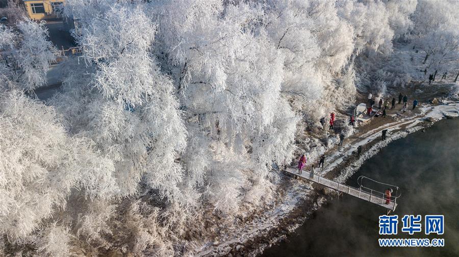 當日,吉林省吉林市出現霧凇景觀,松花江畔的樹木仿佛披上了銀色盛裝。