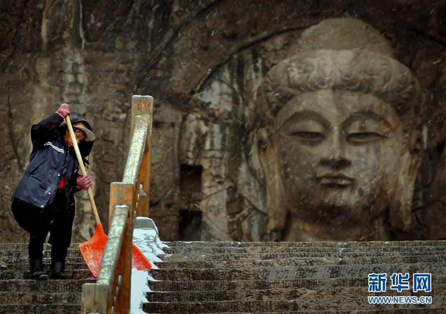 1月9日,清潔工在洛陽龍門石窟景區(qū)內的盧舍那大佛前清掃積雪。 新華社記者李安攝