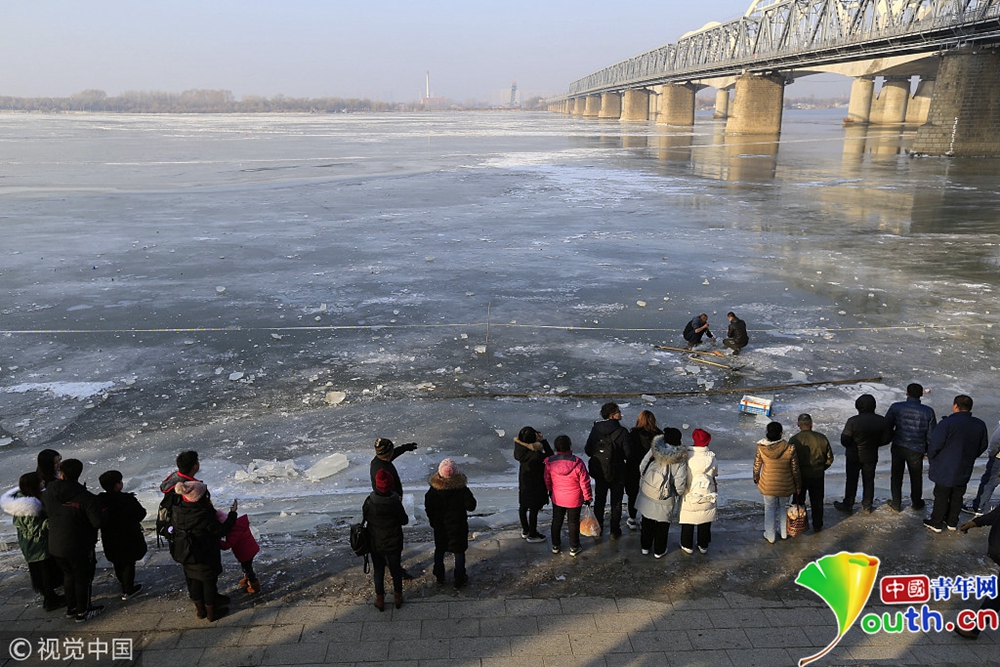 2018年11月25日,黑龍江省哈爾濱市,松花江封江不久,已經(jīng)有人蹬江鑿冰下網(wǎng)捕魚。 圖片來(lái)源:視覺中國(guó)