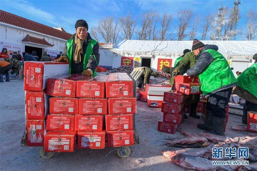 12月27日,在吉林松原查干湖漁場(chǎng),工人們將魚裝箱。 隨著吉林松原查干湖冬捕知名度不斷提高,全國(guó)各地消費(fèi)者對(duì)查干湖魚的需求量逐年增大。2014年開始,多個(gè)電商平臺(tái)和快遞企業(yè)紛紛抓住商機(jī)進(jìn)駐查干湖。經(jīng)過多年發(fā)展,借助互聯(lián)網(wǎng)銷售優(yōu)勢(shì)和日趨完善的快遞網(wǎng)絡(luò),全國(guó)多地的百姓可以在魚出水后的48小時(shí)內(nèi)品嘗到查干湖魚的鮮美滋味。 新華社記者張楠攝