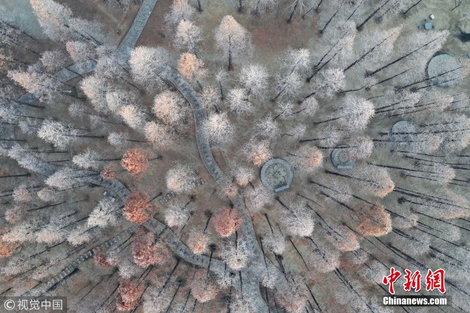 1月13日,霧散日升。河北省邢臺(tái)市大街小巷的樹(shù)枝上掛滿(mǎn)了潔白晶瑩的霜花,藍(lán)天下微風(fēng)吹拂銀絲閃爍,奇麗壯觀。給臘八節(jié)日增添了亮麗的風(fēng)景?;艏t軍 攝 圖片來(lái)源:視覺(jué)中國(guó)
