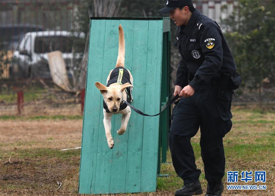 1月15日,警犬“皮特”在訓導員丁巖的帶領下進行崗前特訓。 新華社記者 程敏 攝