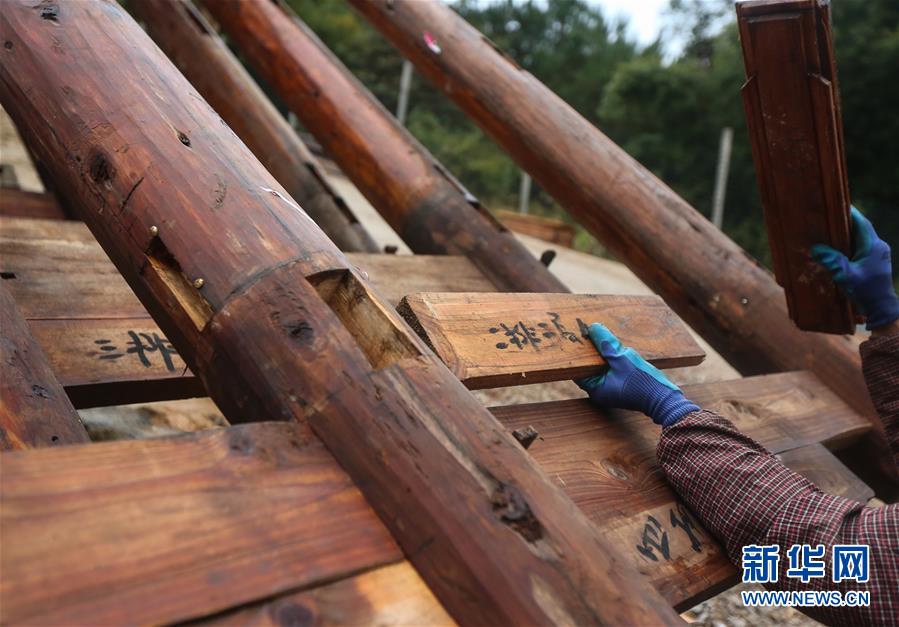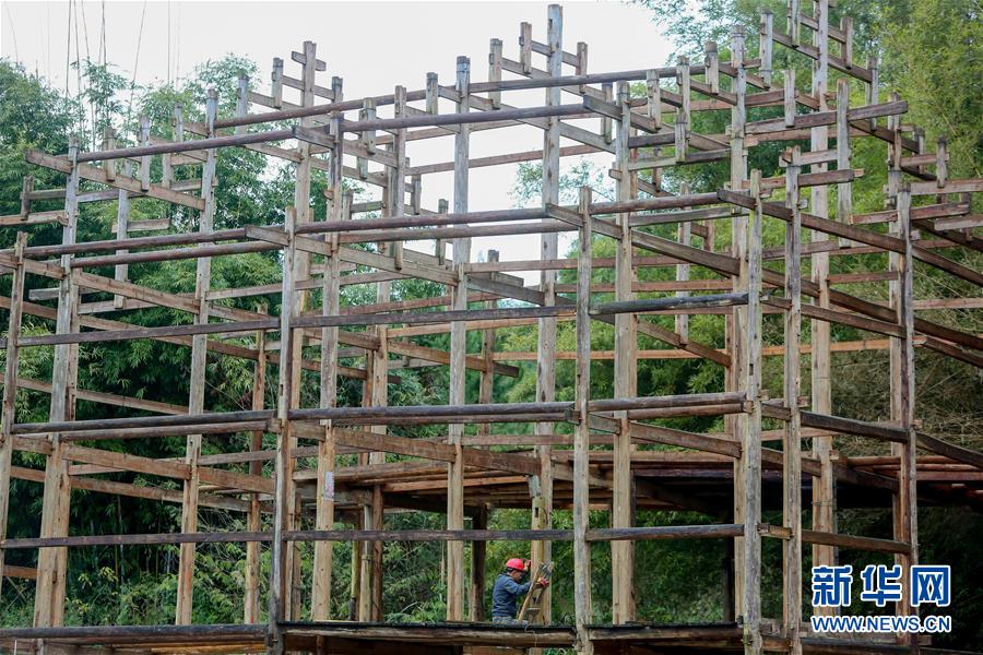 1月15日,在廣西融水苗族自治縣融水鎮(zhèn)夢嗚苗寨,一名工人將苗族吊腳樓的主要結(jié)構(gòu)進行“復(fù)原”安裝。新華社記者 陳君清 攝
