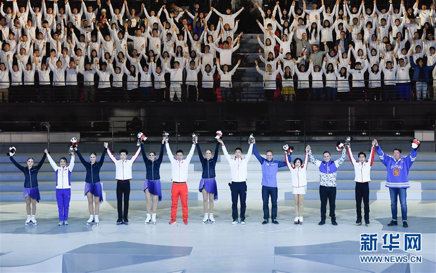 1月15日,中芬運動員代表攜手向觀眾致意。 當日,“2019中芬冬季運動年”開幕式在北京首鋼冰球館舉行。 新華社記者申宏攝