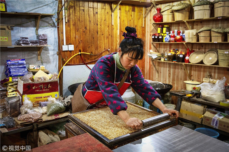 重慶江津區(qū)中山古鎮(zhèn)第十四屆 “千米長宴”民俗文化節(jié)盛大啟幕。上午10時,中山古鎮(zhèn)老街人聲鼎沸,窄窄的青石板路打掃得干干凈凈,家家戶戶門口掛起喜慶的紅燈籠,老商鋪門口擺滿了米酒、烤糍粑、煙熏豆腐……此次“千米長宴”以“絲路情緣,‘?!现猩健睘橹黝}。“千米長宴”期間,游客們不僅可以一雙筷子吃遍全街,還可欣賞到祈福祭祀、民俗拜年、“打盆上菜”等表演,同時還增設(shè)了以唱、跳、講故事的上菜方式情景演繹愛情主題的文化餐飲,展示富硒愛情宴的文化內(nèi)涵。圖為街坊們在頭天就開始準(zhǔn)備各種菜肴與小吃。