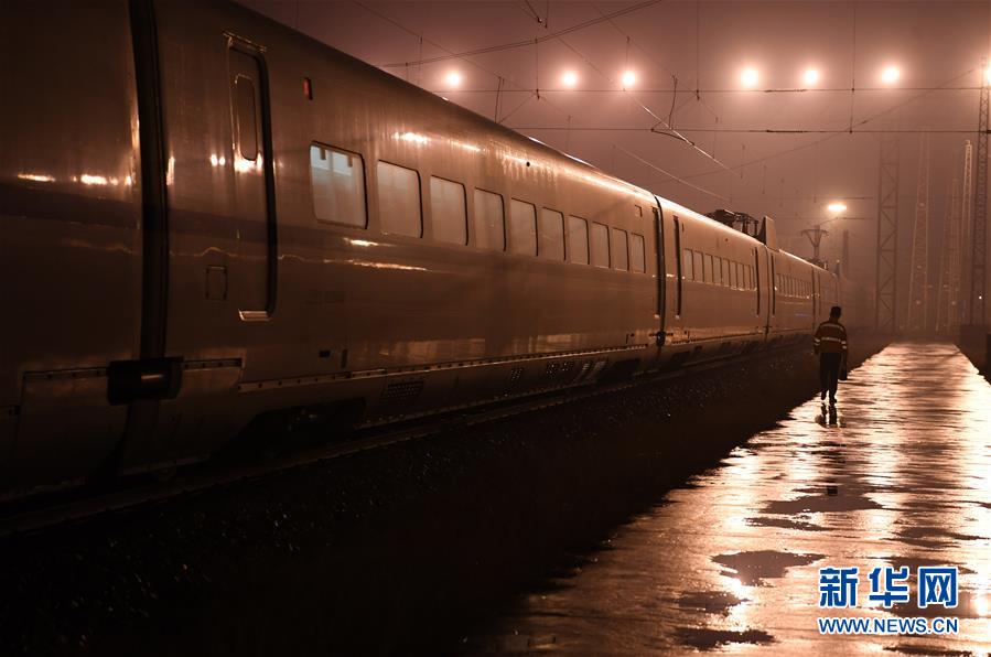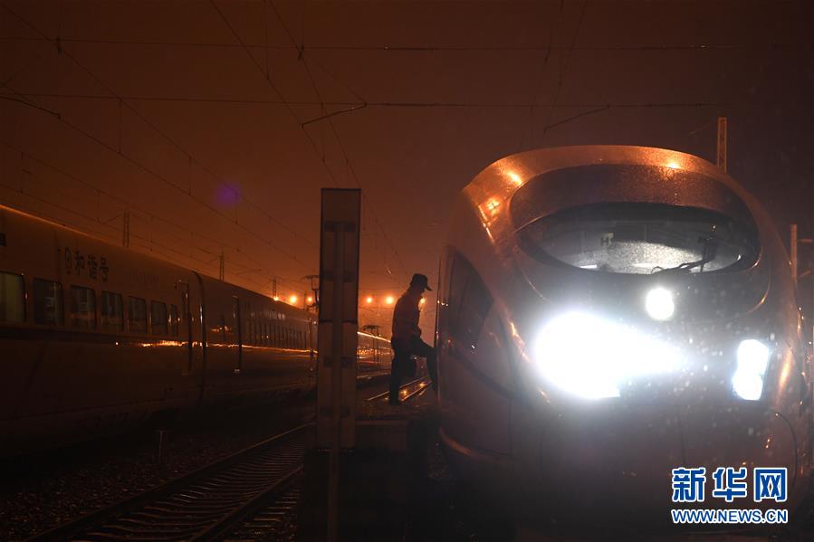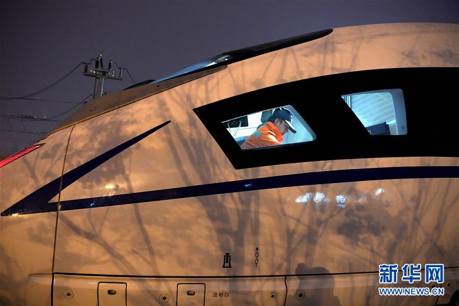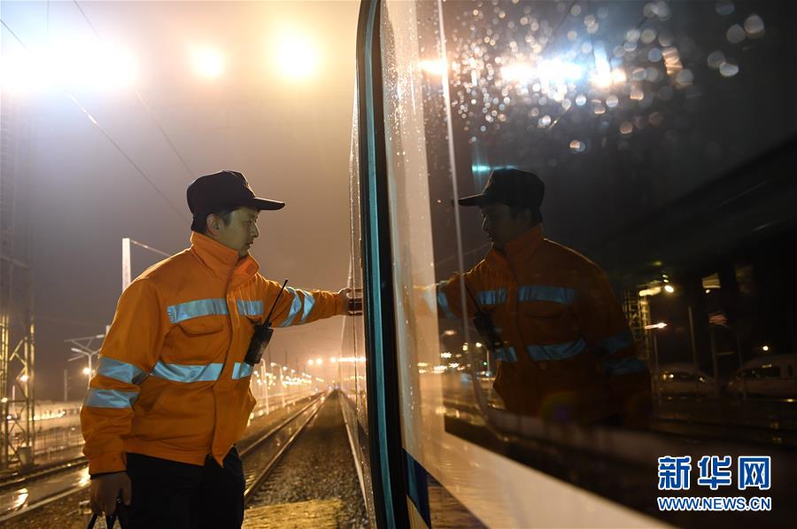 1月29日,王瑞在合肥南動(dòng)車(chē)運(yùn)用所進(jìn)行動(dòng)車(chē)組連掛作業(yè)。新華社記者劉軍喜攝