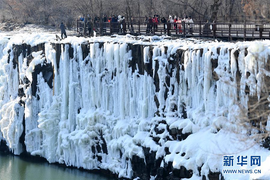 2月25日,游客在觀賞冰瀑景觀。 去冬今春以來,黑龍江省鏡泊湖的吊水樓冰瀑景色壯觀,吸引許多游人前來觀賞。 新華社記者 王建威 攝